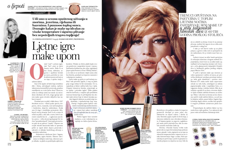 Ljetni make-up priča je o prihvaćanju suštine vaše prirodne ljepote, a onaj za plažu prije svega trebao bi biti minimalan. Uz to, najnužniji je faktor zaštita kože lica i tijela. Umjesto intenzivne šminke, orijentirajte se na nježan i prirodan izgled. Teške pudere ostavite kod kuće, a umjesto njih predlažem tonirane kreme koje će još blijedom licu dodati malo zdrave boje te tekuće bezuljne pudere laganih tekstura za prekrivanje nedostataka i izjednačavanje boje tena. Postoji i bogata paleta nježnih ružičastih rumenila koja možete koristiti ljeti te bronzera različitih tekstura i nijansi koji nakon nanošenja čine da izgledate kao da vas je poljubilo sunce. Nakon lagane baze nanesite maskaru, a one vodootporne su najbolje za vlažnu ljetnu klimu.
