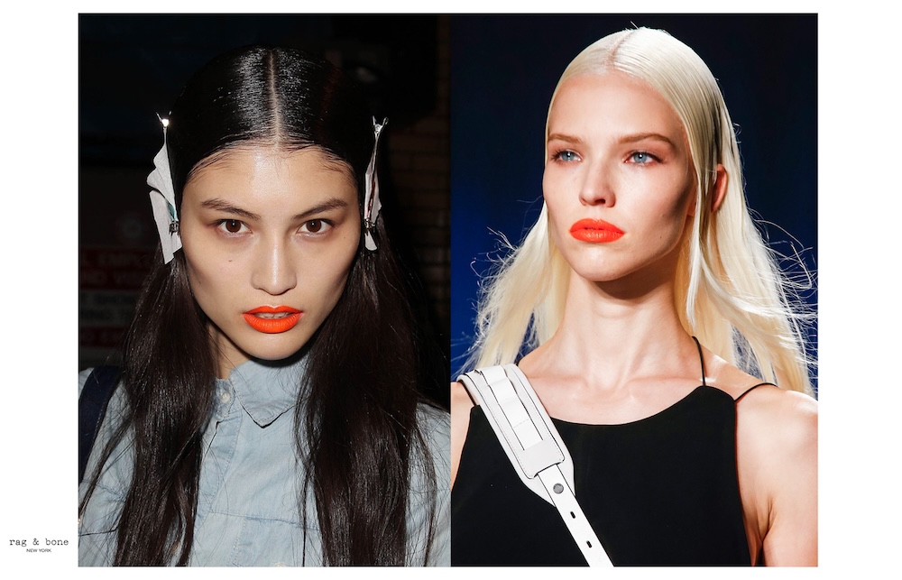 Definitivno hit boja usana sezone. Iako naravno nije prvi puta da je narančasta nijansa ruža viđena na revijama, ove sezone prisutna je u mat varijanti, kombainaciji svijetlog tena i definiranim obrvama. Nadraži mi je look sezone koji je osmislila Gucci Westman za Rag & Bone, a ruž koji je koristila je Revlon ColorBurst Matte Balm in Mischieovus. Nakon što ste aplicirali ruž, prislonite papirnatu maramicu na usne za mat efekt.