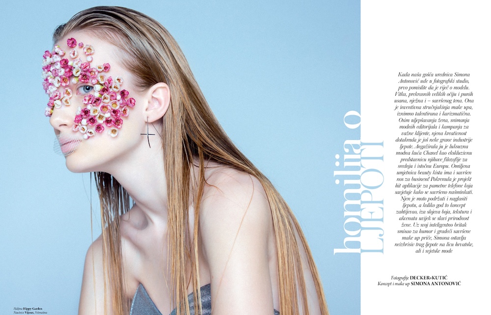 Kada naša gošća urednica Simona Antonović uđe u fotografski studio, prvo pomislite da je riječ o modelu. Vitka, prekrasnih velikih očiju i punih usana, nježna i - savršenog tena. Ona je inventivna stručnjakinja make upa, iznimno talentirana i karizmatična. Osim uljepšavanja žena, snimanja modnih editorijala i kampanja za važne klijente, njena kretivnost dotaknula je još neke grane industrije ljepote. Angažirala ju je luksuzna modna kuća Chanel kao eskkluzivnu predstavnicu njihove filozofije za srednju i istočnu Euopu. Omiljena umjetnica beauty kista ima i savršen nos za biznis. Pokrenula je projekt hit aplikacije za pametne telefone koja savjetuje kako se savršeno našminkati. Njen je moto podržati i naglasiti ljepotu, a koliko god to koncept zahtijevao, iza slojeva boja, teksutra i akcenata uvijek se slavi prirodnost žene. Uz svoj inteligentno britak smisao za humor i gradeći savršene make up priče, Simona ostavlja neizbrisiv trag ljepote na licu hrvatske, ali i svjetske mode.
