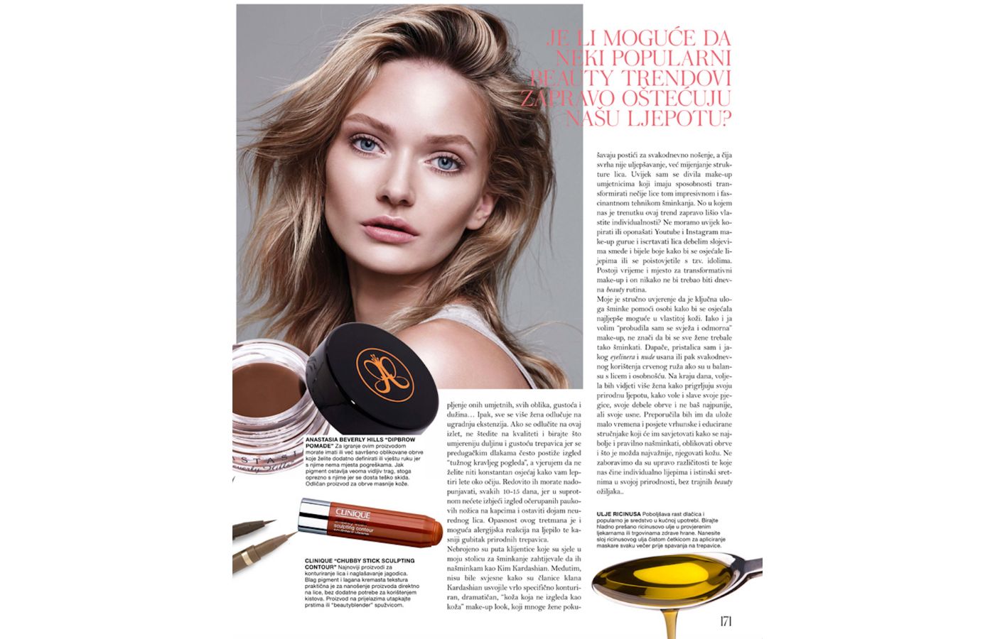 Nebrojeno su puta klijentice koje su sjele u moju stolicu za šminkanje zahtijevale da ih našminkam kao Kim Kardashian. Međutim, nisu bile svjesne kako su članice klana Kardashian usvojile vrlo specifično konturiran, dramatičan, "koža koja ne izgleda kao koža" make-up look, koji mnoge žene pokušavaju postići za svakodnevno nošenje, a čija svrha nije uljepšavanje, već mijenjanje strukture lica. Uvijek sam se divila make-up umjetnicima koji imaju sposobnosti transformirati nečije lice tom impresivnom i fascinantnom tehnikom šminkanja. No u kojem nas je trenutku ovaj trend zapravo lištio vlastite individualnosti? Ne moramo uvijek kopirati ili oponašati Youtube ili Instagram make-up gurue i iscrtavati lica debelim slojevima smeđe i bijele boje kako bi se osjećale lijepima ili se poistovjetile s tzv. idolima. Postoji vrijeme i mjesto za transformativni make-up i on nikako ne bi trebao biti dnevna beauty rutina.